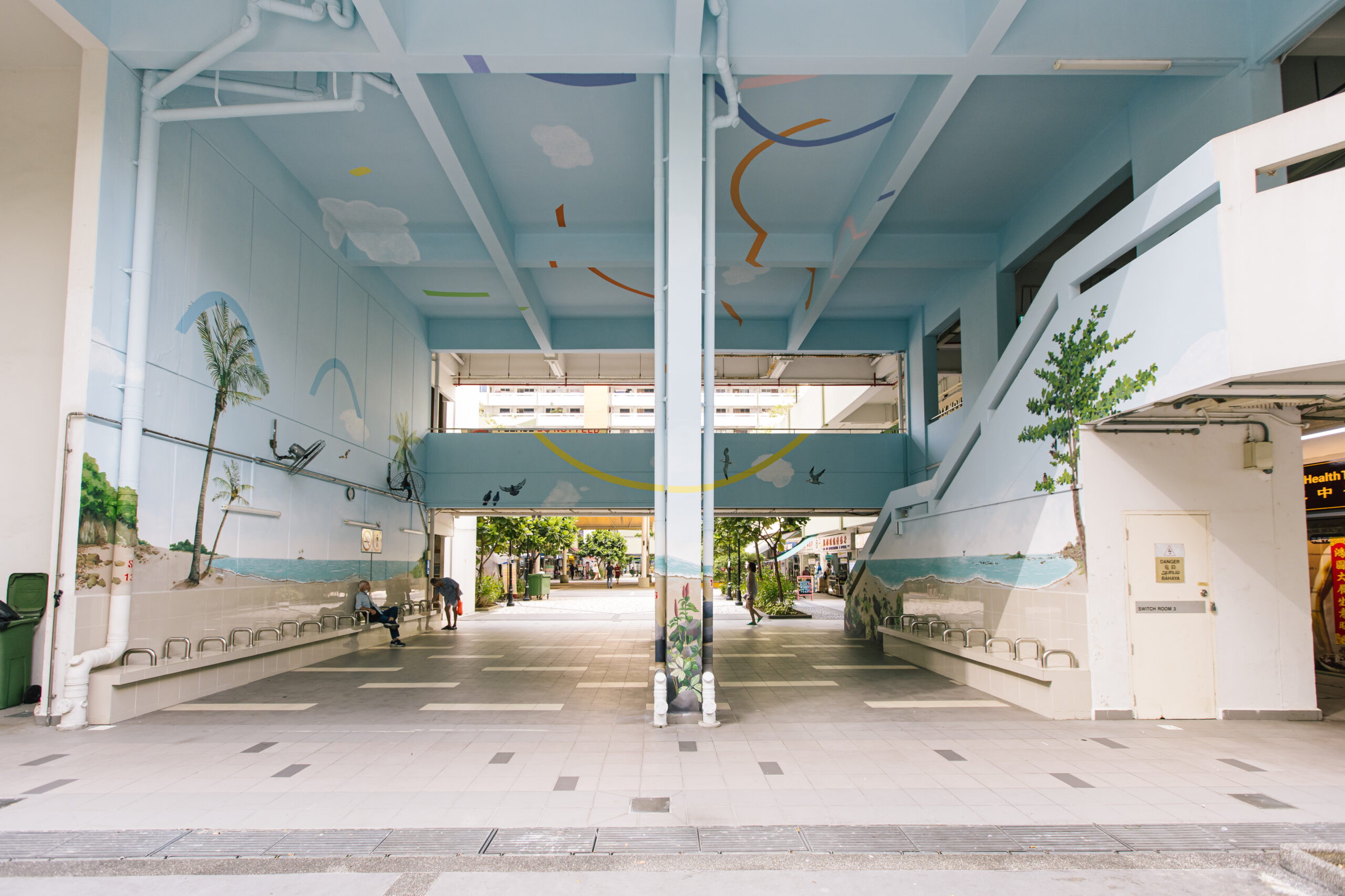 At the Residents’ Corner of Block 4 on Level 1, the work considers “island” in its most literal form: a geological landmass surrounded by water. The work at Block 7, Level 3, considers our past, as we gaze back to early 20th century scenes with restored views of historic shophouse architecture, allowing us to visualise the passage of time. The visual intervention at Block 4, Level 3, offers a whimsical take on an incongruous, floating island hidden in the far reaches of Tanjong Pagar Plaza, reflecting the plaza’s reality as an old 1970s public housing estate, standing firm amid newer, taller and shinier buildings.