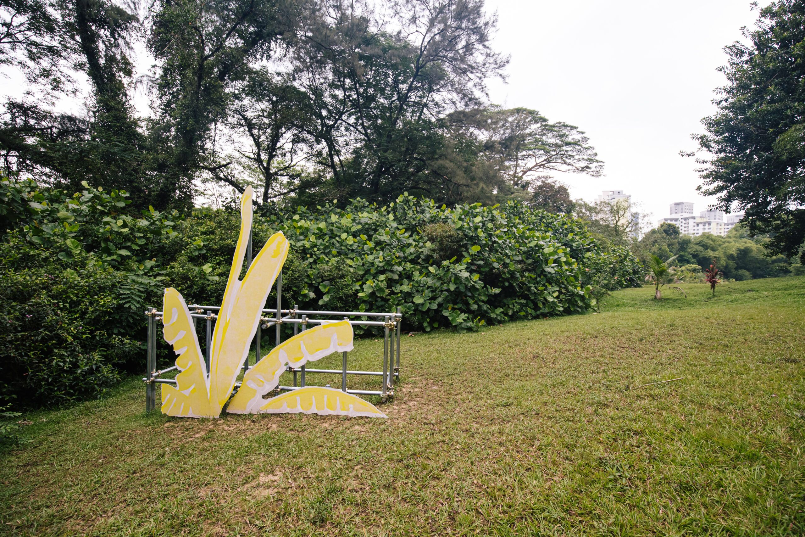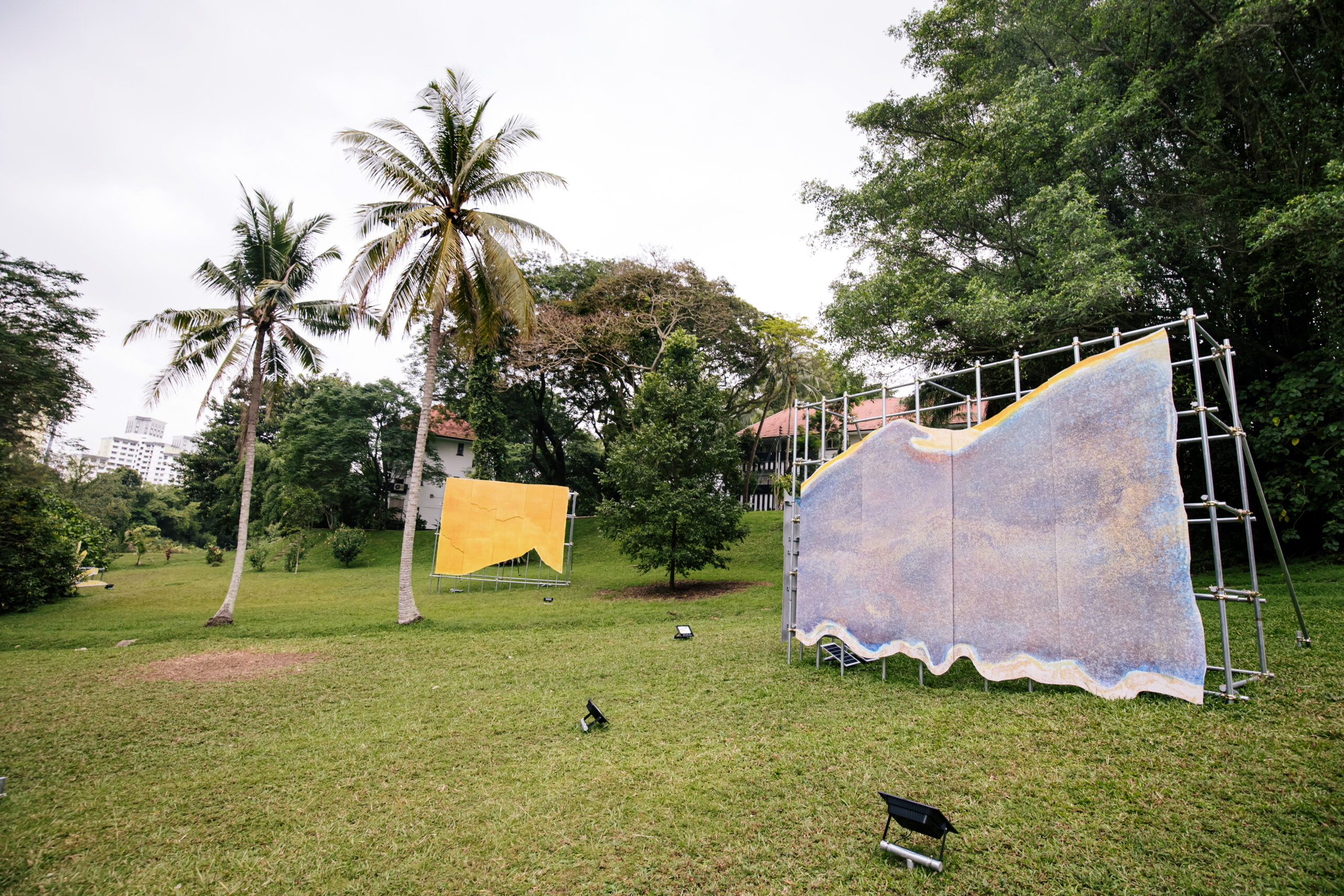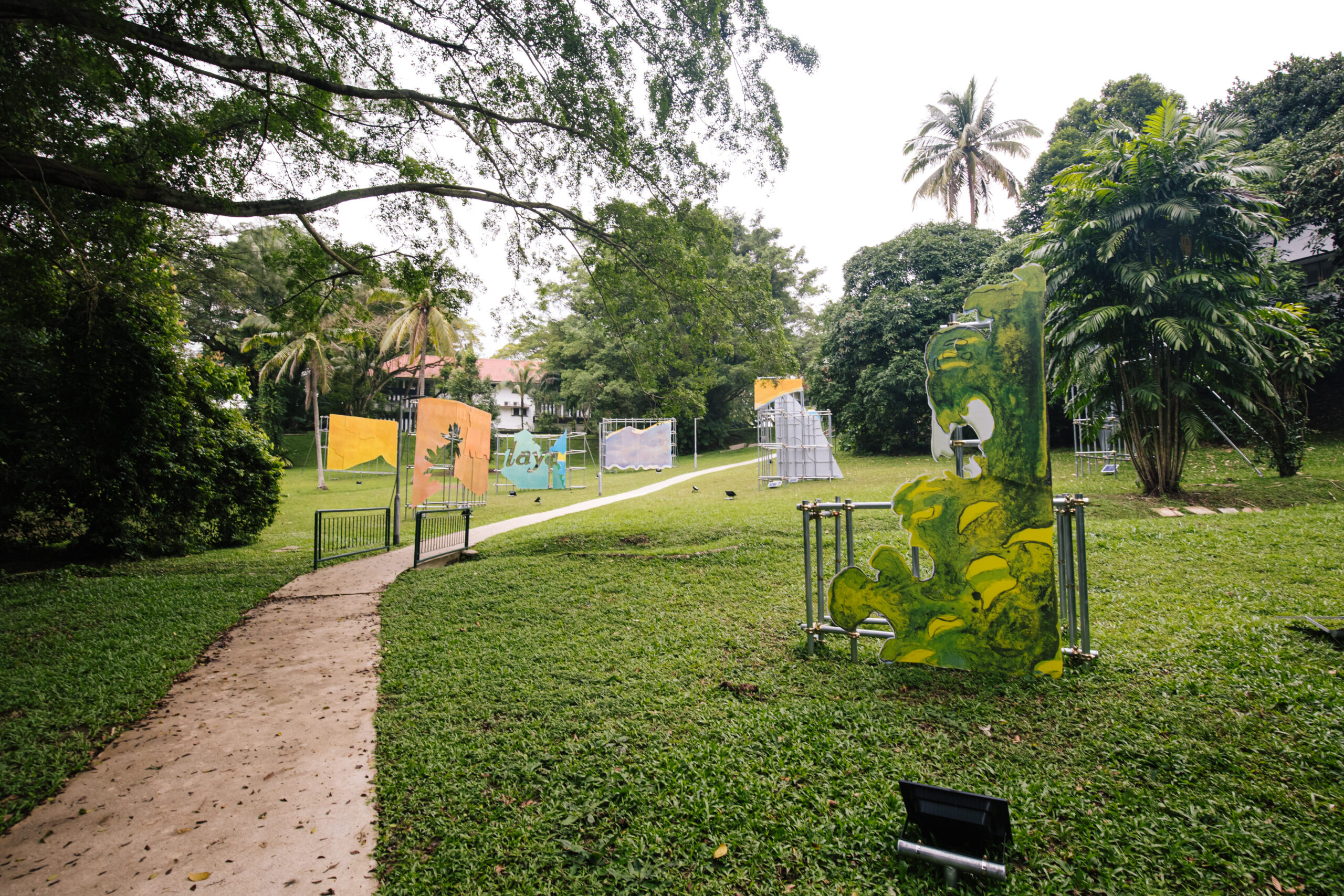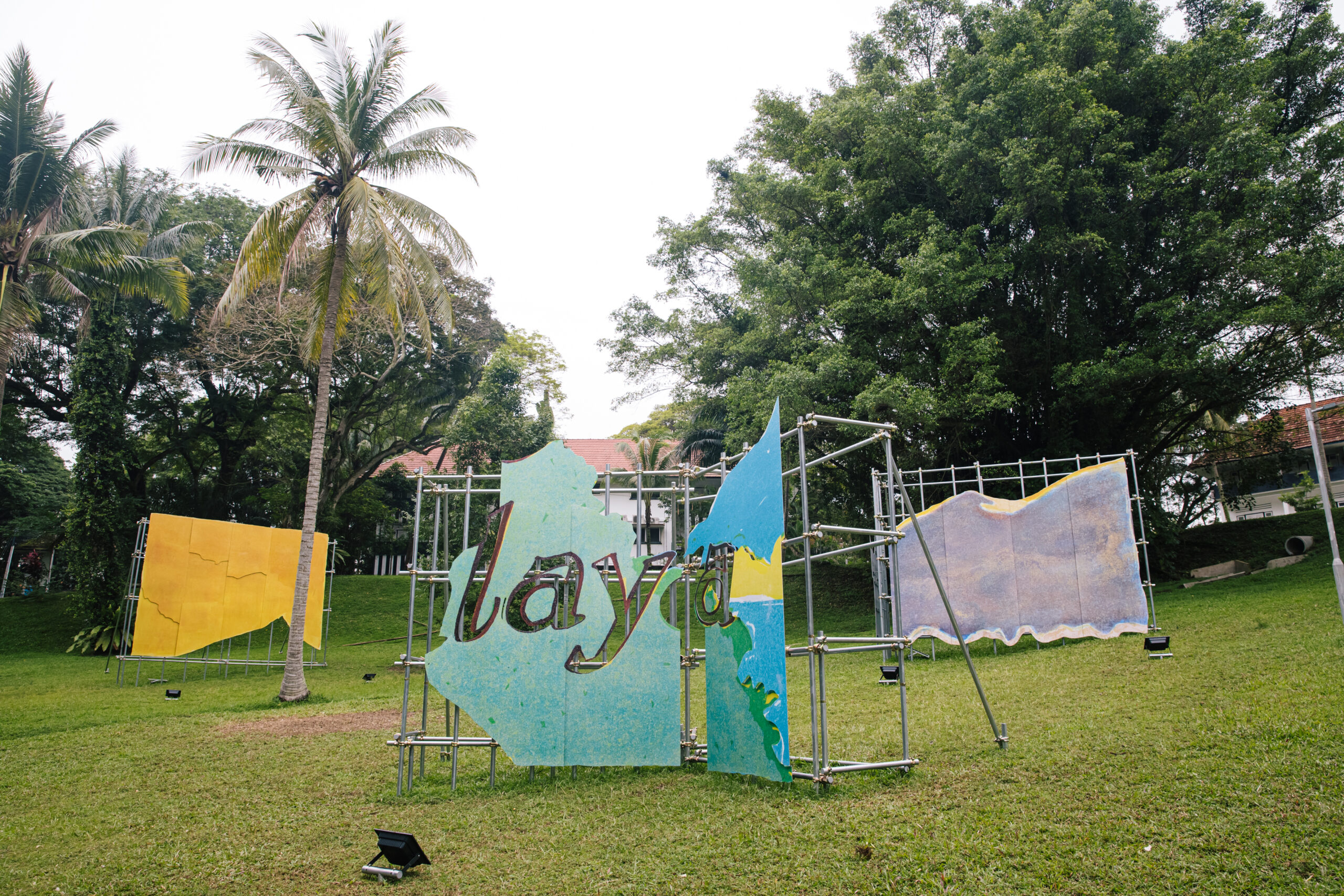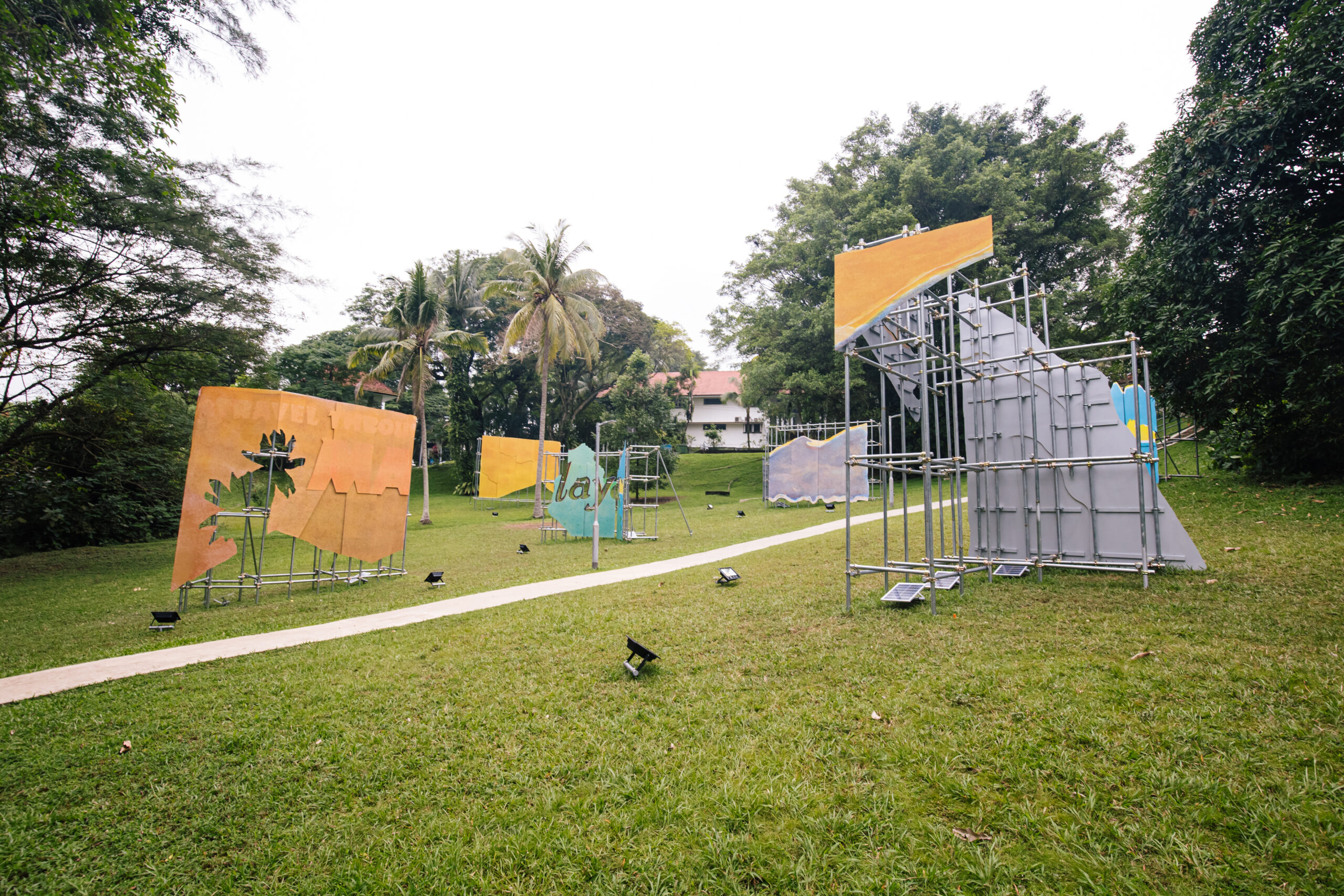 Billboard-sized printouts of lithography printed shapes and forms drawn from early advertising posters of the Federated Malay States Railways (1901–1948) are collaged and arranged across the landscape. As visitors move through the entrance of Wessex Estate from the Rail Corridor, they encounter an immersive tableau. Through his act of extracting and recompositing elements from early tourism advertisements, Hilmi creates a confrontation with a familiar yet unexpected space.