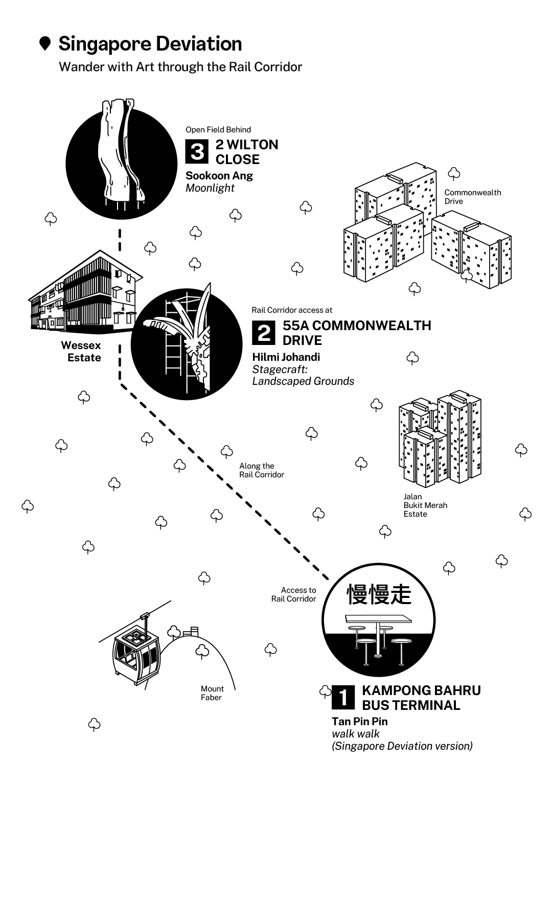 Singapore Deviation is a series of public art commissions exploring the iconic Rail Corridor in Singapore through the works of three artists: Sookoon Ang, Hilmi Johandi, and Tan Pin Pin. Conceived as site-specific installations, each artist offers a unique entry point into the evolving uses of the site, from colonial railway to wildlife corridor and recreational trail.