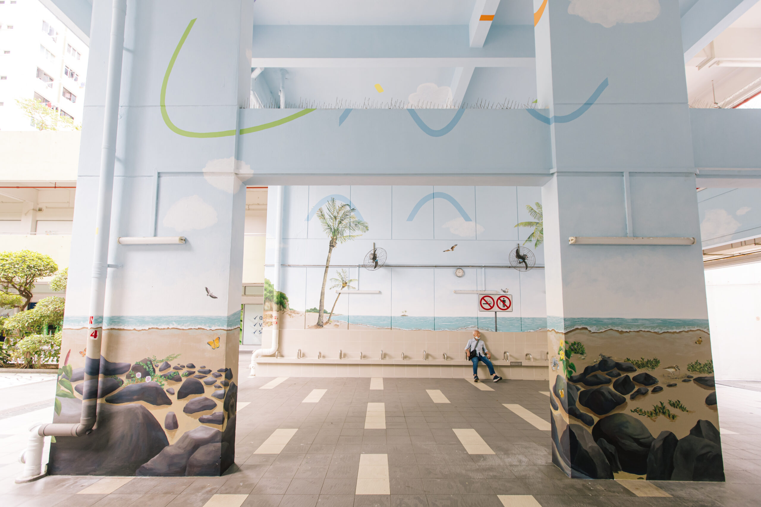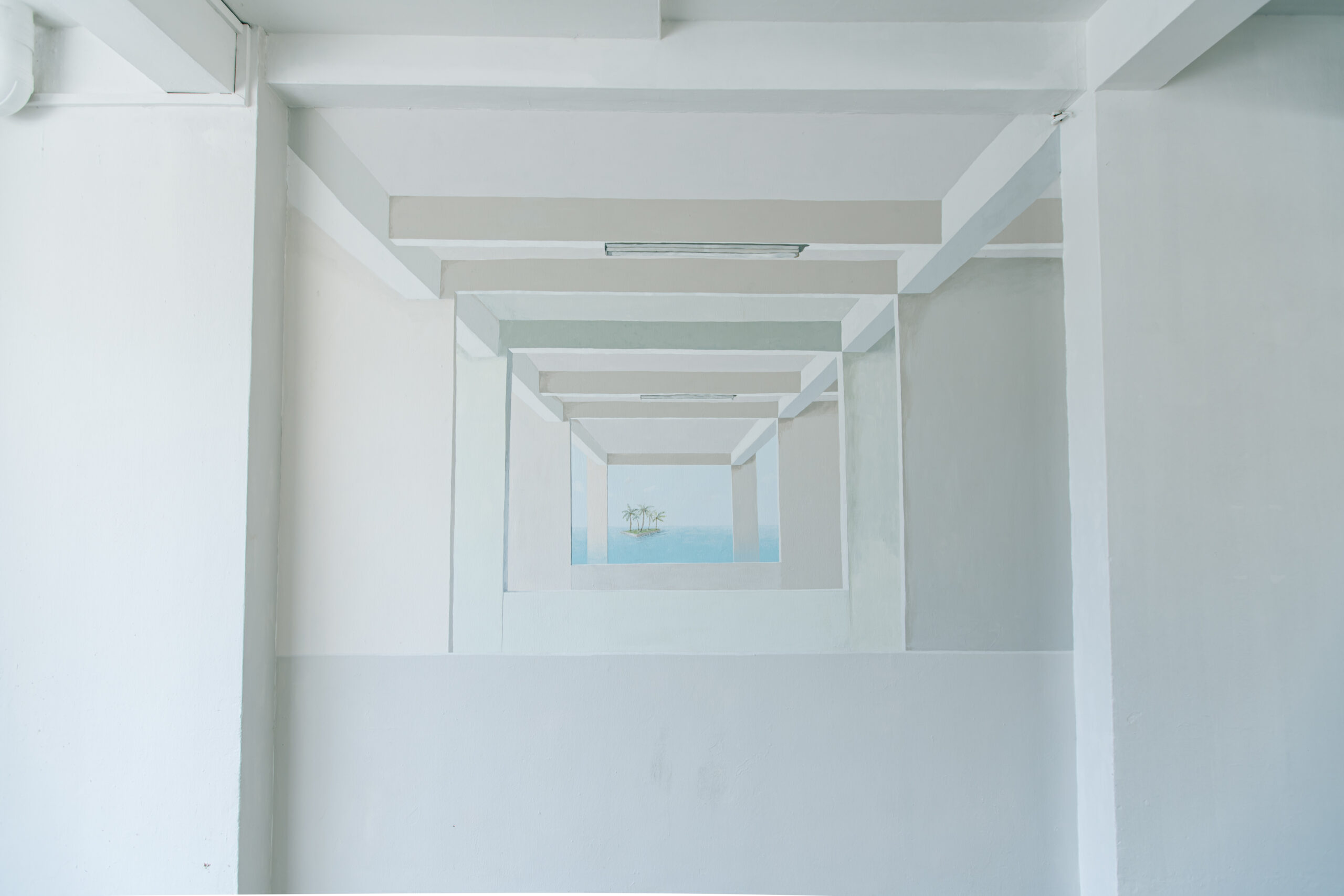 At the Residents’ Corner of Block 4 on Level 1, the work considers “island” in its most literal form: a geological landmass surrounded by water. The work at Block 7, Level 3, considers our past, as we gaze back to early 20th century scenes with restored views of historic shophouse architecture, allowing us to visualise the passage of time. The visual intervention at Block 4, Level 3, offers a whimsical take on an incongruous, floating island hidden in the far reaches of Tanjong Pagar Plaza, reflecting the plaza’s reality as an old 1970s public housing estate, standing firm amid newer, taller and shinier buildings.