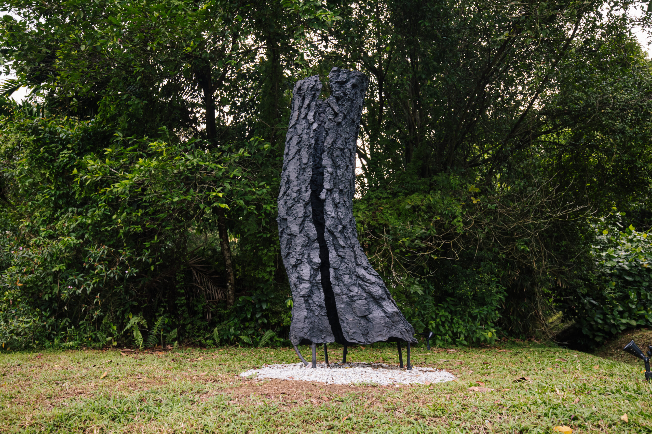 A cast bronze sculpture that embodies the fossilised remains of terrestrial vegetation. During the day, the sculpture is a sublimation of a burnt log, its digitally-modified body appearing as a mirage amidst the landscape of Wessex Estate. At night, the sculpture recedes into the shadowy vegetation surrounds. Encounters with this peculiar object along the clearing is quite like traversing the boundary between imaginative form and objective reality.ย ย